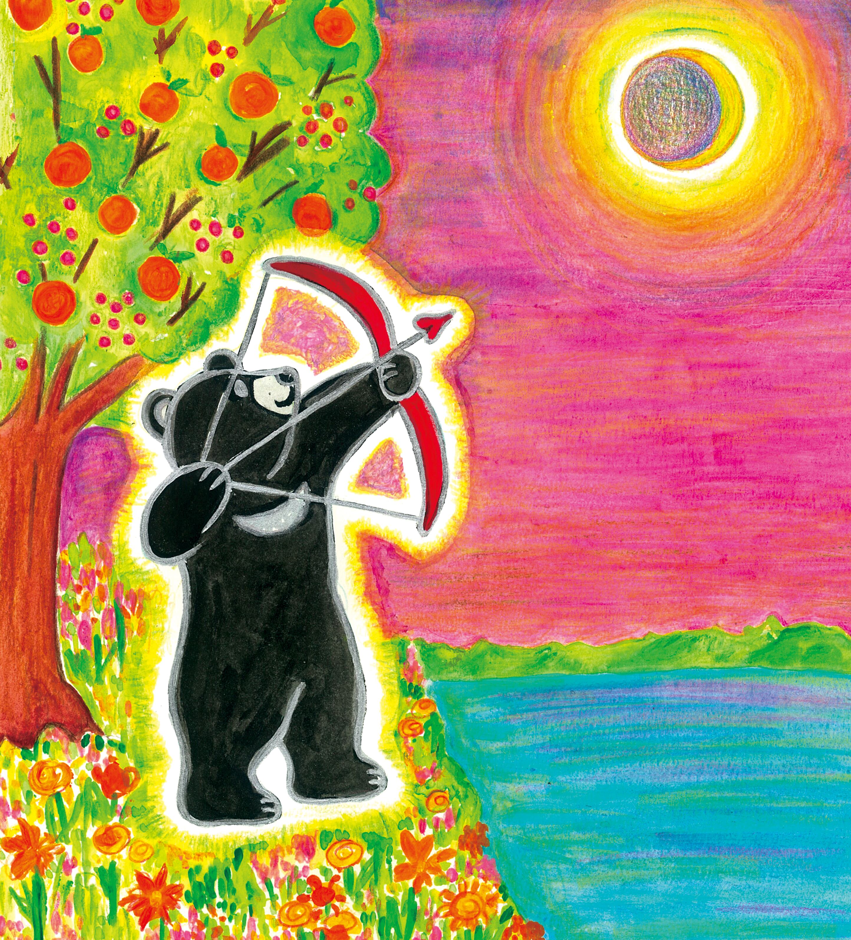 熊は、神の使いというより神そのもの、「神の化身」であると考えられています。特にアイヌでは、ヒグマを「キムンカムイ(山の神)」と呼んでいました。山の神といえば、大山咋神(オオヤマクイノカミ)。姉妹作『円結びカード』の弓を射ようとする大山咋神をメルヘン調で描きました。