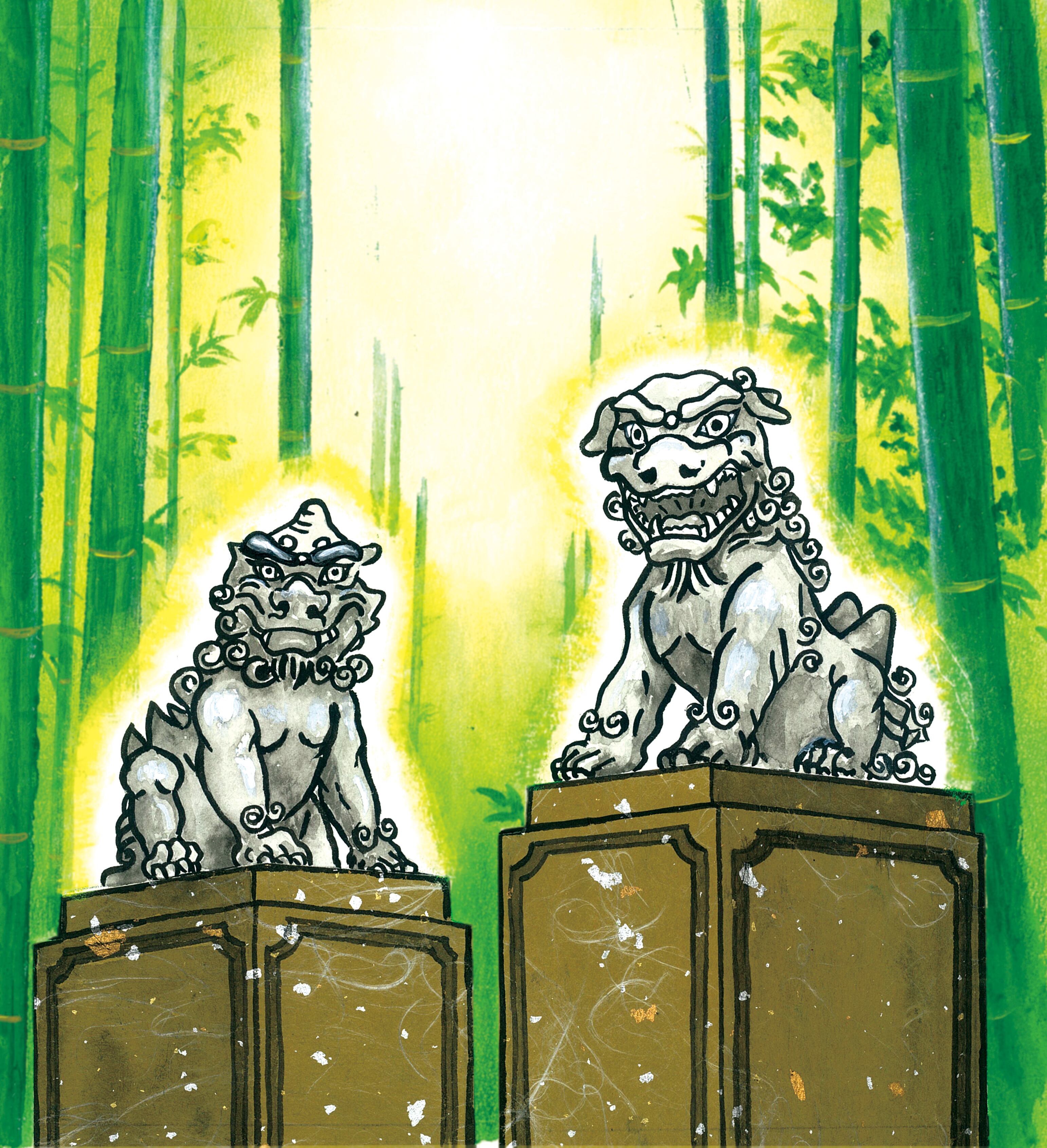 狛犬は、神域への邪気の侵入を防ぐ魔除けとしての役割を担っています。口を開けている「阿形(アギョウ)」と閉じている「吽形(ウンギョウ)」の二体で一対。「阿吽」とは、サンスクリット語が由来で「宇宙の最初と最後」を意味していると言われています。多くの神社を巡った中、一番心惹かれた狛犬さん達をモデルにしました。