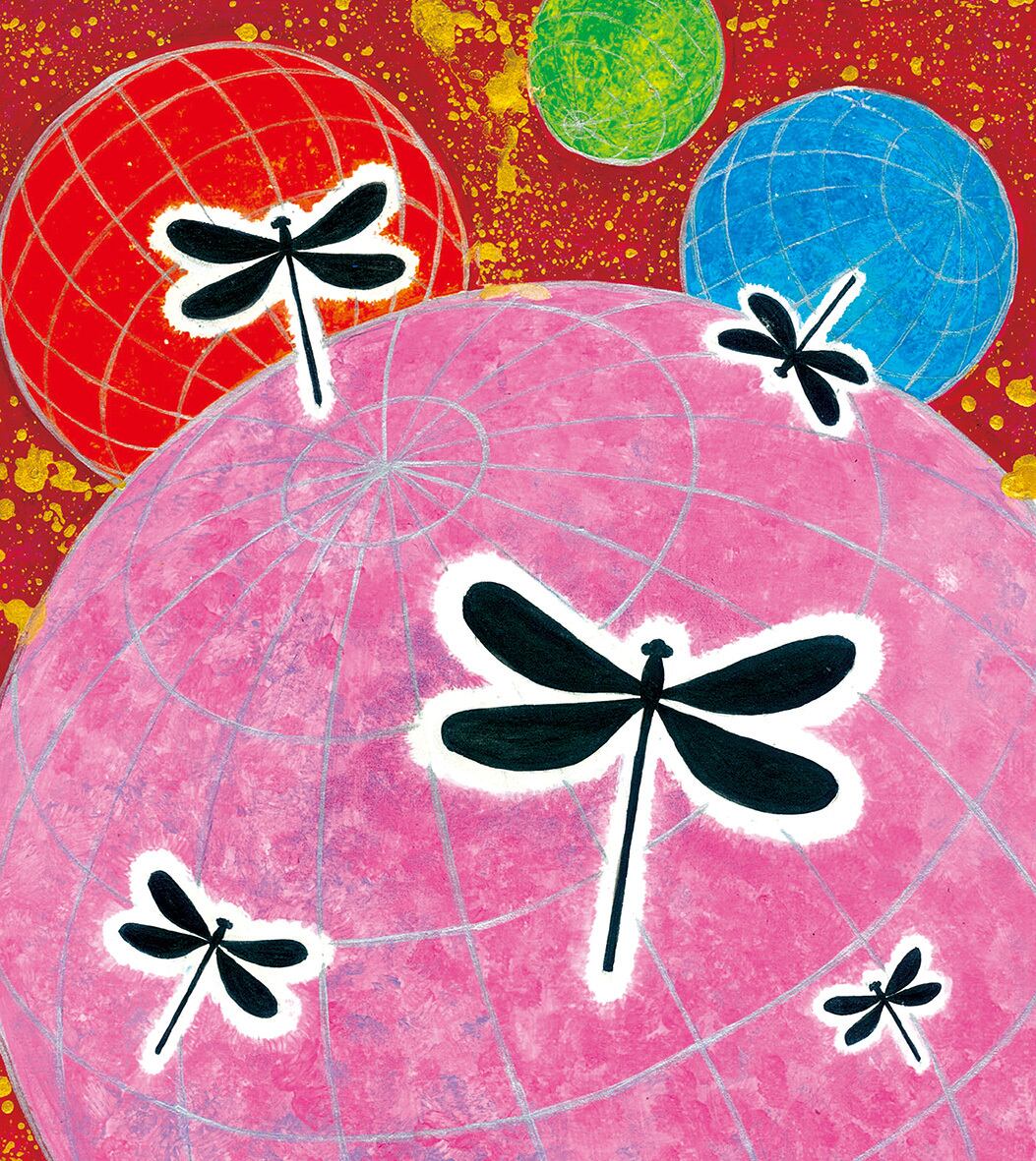 イラストのモデル「ハグロトンボ」は、水と空気が清浄な場所に生息します。羽を開閉する様子が、手を合わせて神様に祈る姿に似ていることから「神様トンボ」とも言われ、神の使いとして大事にされています。トンボは前にしか進めないので、「勝ち虫」として武将の装飾品などにも採用される縁起のいい生き物です。