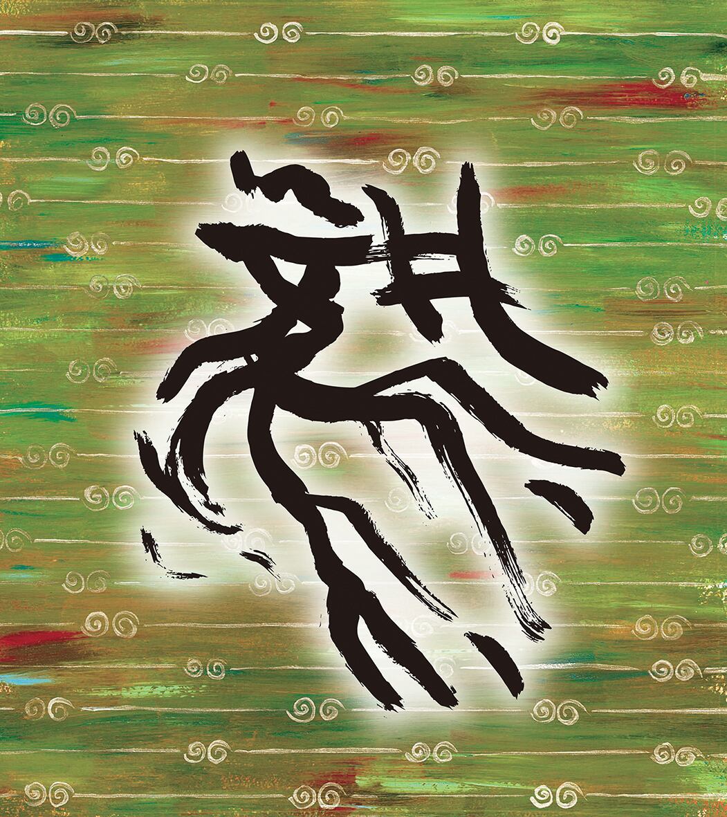風神は、日本神話に登場するイザナギとイザナミの間に生まれた「シナツヒコ」または「シナトべ」の神とされています。風を操る神で、植物の成長や航海においても重要な存在です。自然が神格化し、形を持った代表例といえます。イラストは、古代の象形文字、甲骨文体で「風」を表したものです。