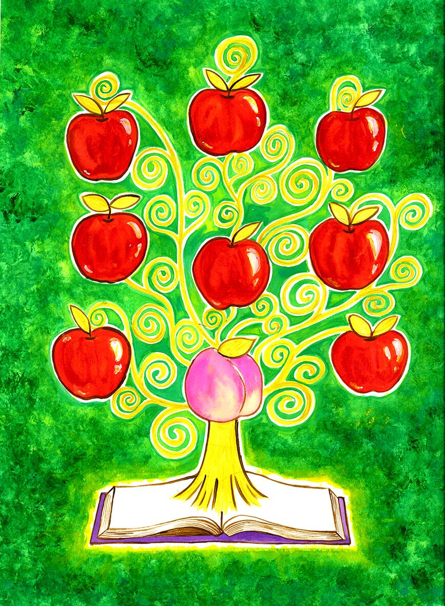 賢者、思兼神。知恵をリンゴ、生命を桃の実に見立て、生命の樹として思兼神の力をイメージしています。