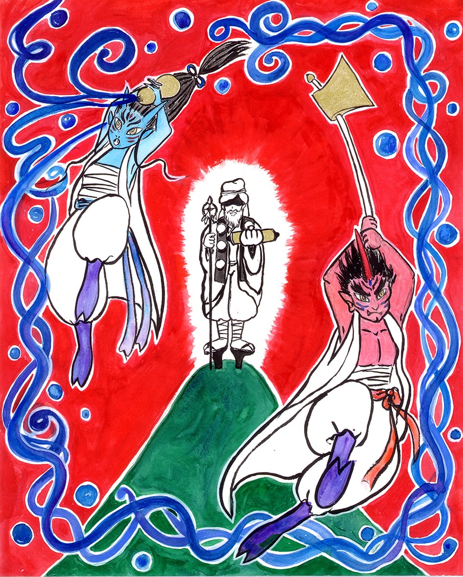 鬼達とともに、人々の暮らしをより豊かにするため尽力した小角。夫の前鬼は鉄斧を持ち、道を切り開く役目。妻の後鬼は、理水(霊力のある水)が入った水瓶をもって、夫が拓いた道を整える様子をイメージしました。